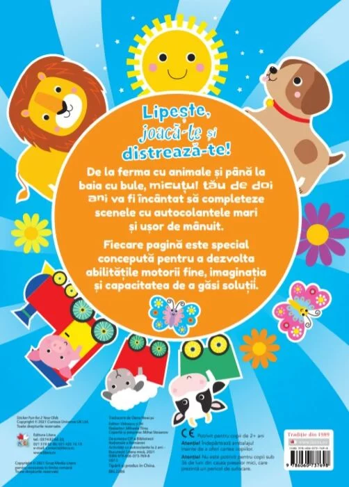De la ferma cu animale și până la baia cu bule, micuțul tău de doi ani va fi încântat să completeze scenele cu autocolantele mari și ușor de mânuit.