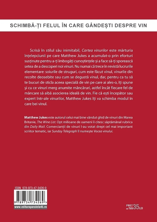 Scrisă în stilul său inimitabil, Cartea vinurilor este mărturia înțelepciunii privind vinurile, pe care Matthew Jukes a acumulat-o prin eforturi susținute pentru a-ți îmbogăți cunoștintele și a face să-ți sporească setea de a descoperi noi vinuri. Nu numai că trece în revistă lucrurile elementare: soiurile de struguri, cum este făcut vinul, vinurile din recolte deosebite sau cum se degustă vinul, dar, pentru ca tu să te bucuri de sticla aceea specială de vin pe care ai ales-o, îți spune și cu ce vinuri merg anumite mâncăruri, astfel încât fiecare fel de mâncare să aibă asocierea ideală de vin. Fie că ești începător, fie că ești expert într-ale vinurilor, Matthew Jukes îți va schimba modul în care bei vinul.
