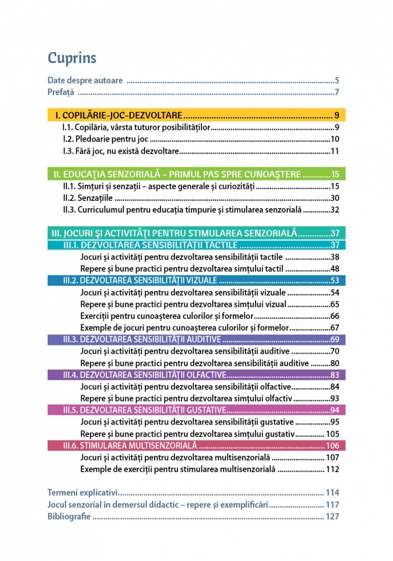 Lucrarea valorifică oportunitățile pe care le oferă jocurile și activitățile senzoriale în educația la vârstele timpurii, aducând în atenție abordări eficiente, probate în activitatea profesională.
