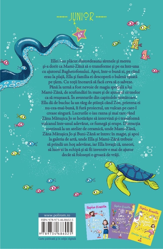 Ellei i-au plăcut dintotdeauna sirenele și mereu și-a dorit ca Mami-Zînă să o transforme și pe ea într-una cu ajutorul Baghetofonului. Apoi, într-o bună zi, pe cînd erau la plajă, Ella și familia ei descoperă o balenă eșuată pe ţărm. Cu toţii încearcă să facă ceva să o salveze. Pînă la urmă a fost nevoie de magia specială a lui Mami-Zînă, de scufundări în mare și de ajutorul sirenelor ca să reușească. În aventurile din capitolele următoare, Ella dă de bucluc la un tîrg de știinţă cînd Zoe, prietena ei nu-cea-mai-bună, îi fură proiectul, un vulcan pe care-l crease singură. Lucrurile o iau razna și mai tare cînd Zîna Mătușica Jo se hotărăște să intervină și-i transformă vulcanul într-unul adevărat, ce fumegă și erupe. Distracţia continuă la un atelier de ceramică, unde Mami-Zînă, Zîna Mătușica Jo și Buni-Zînă se întrec în magie, și apoi la galeria de artă, unde Ella și Mami-Zînă trebuie să prindă un hoţ adevărat, iar Ella învaţă că, uneori, să lucrezi în echipă și să fii inventiv e mai de ajutor decît să folosești o groază de vrăji.