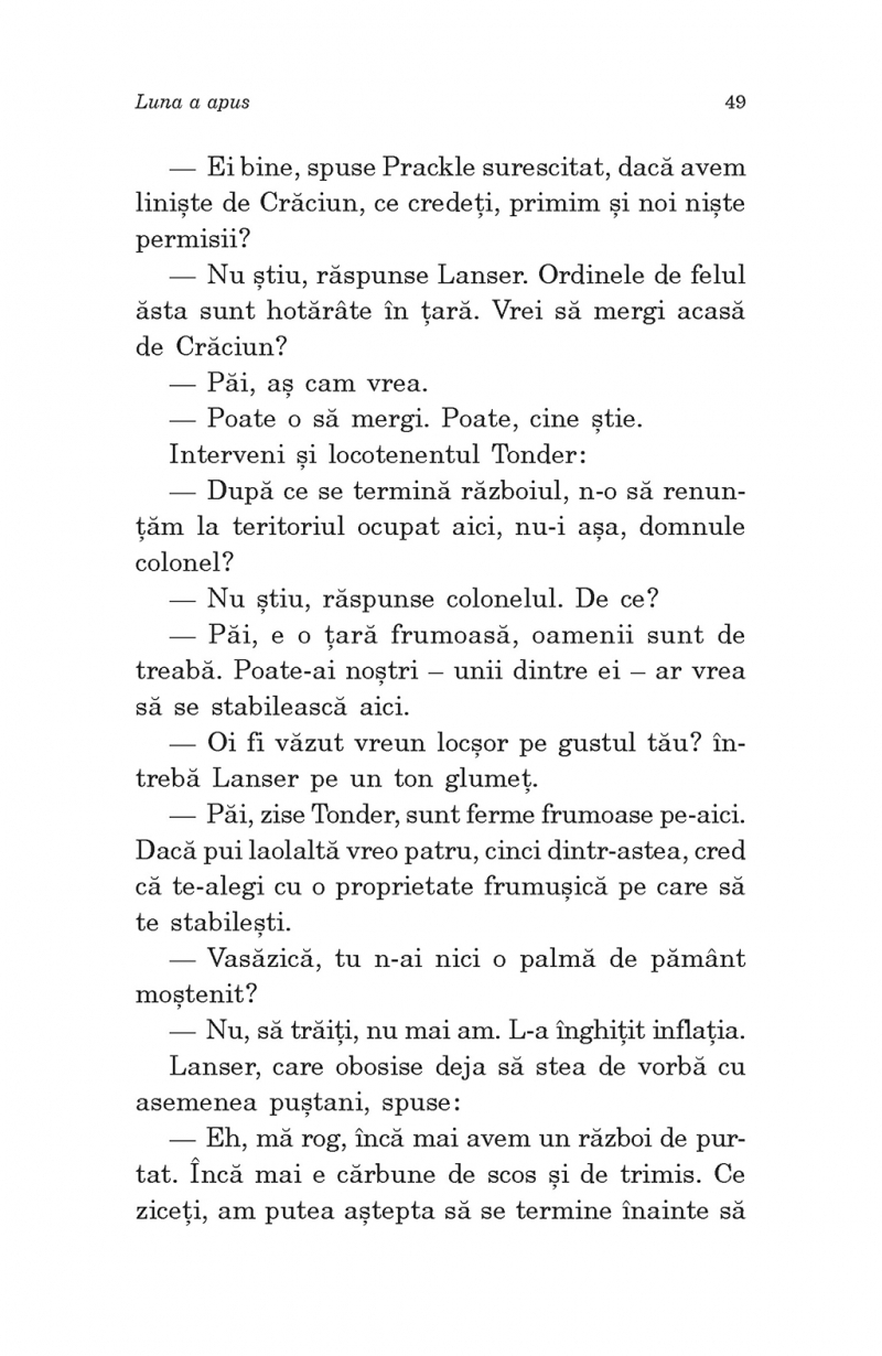 Publicat iniţial la apogeul puterii naziste, romanul Luna a apus explorează efectele invaziei atât asupra învinşilor, cât şi a învingătorilor. Ocupat de trupele inamice, un orăşel liniştit ajunge să se confrunte, în timpul celui de‑al Doilea Război Mondial, nu numai cu răul venit din afară, ci şi cu trădarea născută în sânul acestei comunităţi strânse. Analizând în amănunt sentimentele comandantului şi pe ale trădătorului şi înfăţişând patriotismul plin de curaj al populaţiei, Steinbeck dă la iveală adevăruri profunde, adesea tulburătoare, despre război, dar şi despre natura umană. Această „celebrare a durabilităţii democraţiei“, cum o descrie Steinbeck însuşi, a avut un impact extraordinar ca propagandă a Aliaţilor în ţările ocupate de nazişti. În ciuda eforturilor Axei de a interzice romanul (în Italia fascistă până şi faptul de a te afla în posesia unui exemplar era pedepsit cu moartea), Luna a apus a fost tradus în secret în franceză, daneză, olandeză, suedeză, germană, italiană şi rusă, astfel că sute de mii de copii circulau în Europa, făcând din el de departe cel mai popular text de propagandă din timpul ocupaţiei. Puţine opere literare din epocă au demonstrat cu atâta succes puterea ideilor în faţa oţelului rece şi a forţei brute. Rolul jucat de roman în ridicarea moralului norvegienilor i‑a adus lui Steinbeck numeroase elogii şi medalia Crucea Libertăţii Regele Haakon al VII‑lea. Romanul a fost adaptat chiar de autor pentru scenă în 1942 şi ecranizat în 1943.