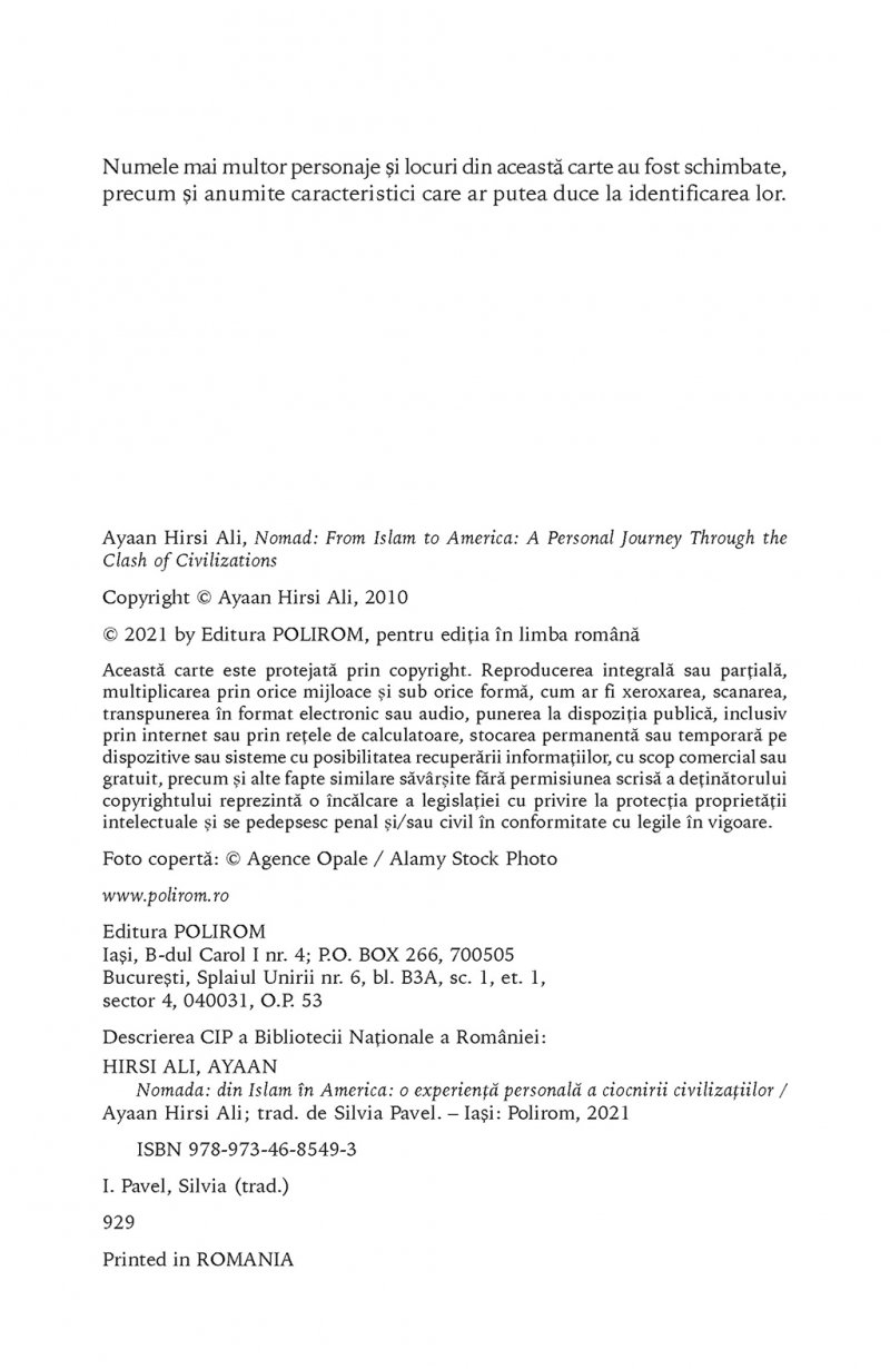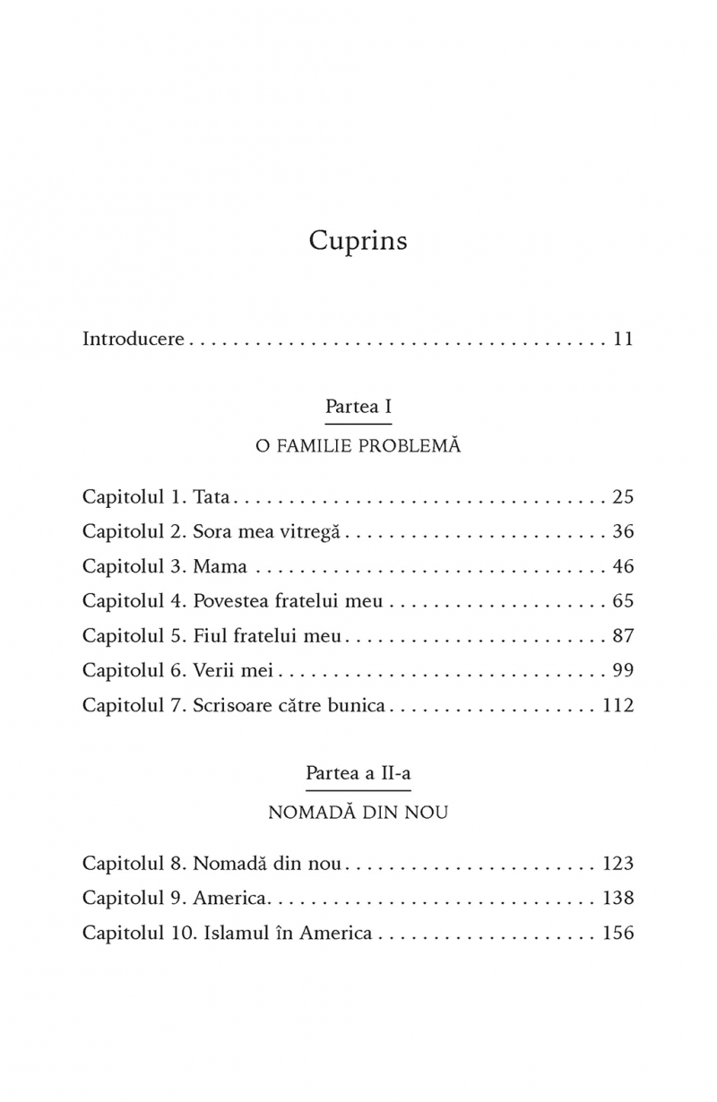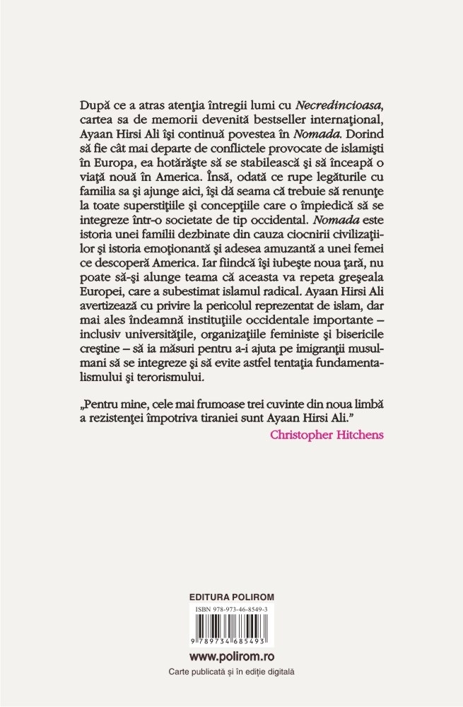 După ce a atras atenția întregii lumi cu Necredincioasa, cartea sa de memorii devenită bestseller internațional, Ayaan Hirsi Ali își continuă povestea în Nomada. Dorind să fie cît mai departe de conflictele provocate de islamiști în Europa, ea hotărăște să se stabilească și să înceapă o viață nouă în America. Însă, odată ce rupe legăturile cu familia sa și ajunge aici, își dă seama că trebuie să renunțe la toate superstițiile și concepțiile care o împiedică să se integreze într-o societate de tip occidental. Nomada este istoria unei familii dezbinate din cauza ciocnirii civilizațiilor și istoria emoționantă și adesea amuzantă a unei femei ce descoperă America. Iar fiindcă își iubește noua țară, nu poate să-și alunge teama că aceasta va repeta greșeala Europei, care a subestimat islamul radical. Ayaan Hirsi Ali avertizează cu privire la pericolul reprezentat de islam, dar mai ales îndeamnă instituțiile occidentale importante ֪– inclusiv universitățile, organizațiile feministe și bisericile creștine – să ia măsuri pentru a-i ajuta pe imigranții musulmani să se integreze și să evite astfel tentația fundamentalismului și terorismului.