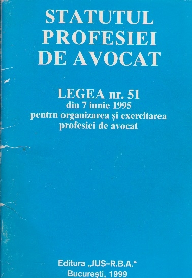 Comandă online Statutul profesiei de avocat. Legea nr. 51 din 7 iunie 1995 la 6,20 lei, tiparită la editura JUS - R.B.A. în anul 1999 cu un număr de 80 pagini de anticariat (foarte buna). Livrare din stoc cu plata ramburs sau online cu cardul.