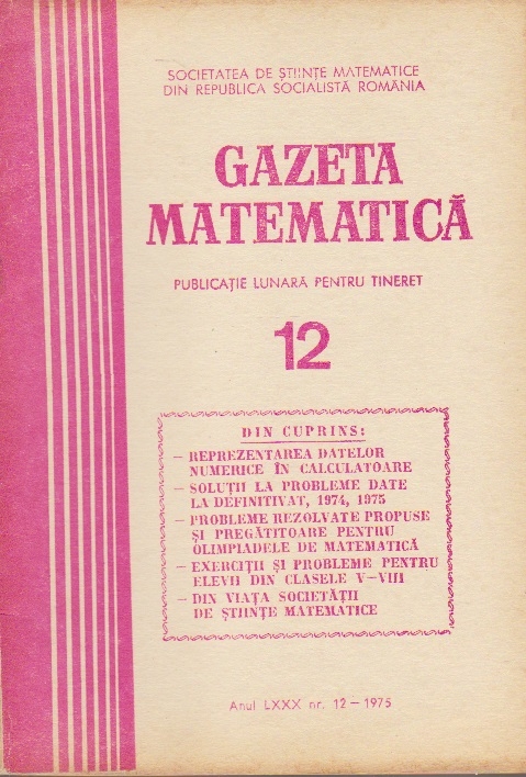 Comandă online cartea "Gazeta Matematica, Nr. 12 - Decembrie 1975" la 4,10 lei scrisă de Societatea de Stiinte Matematice din Romania, tiparită la editura Gazeta Matematica face parte din colecția Gazeta Matematica în anul 1975. cu plata ramburs sau online cu cardul. Momentan titlul "Gazeta Matematica, Nr. 12 - Decembrie 1975" nu este disponibil însa vă puteți înscrie pentru a fi notificat în momenul reaprovizionarii.