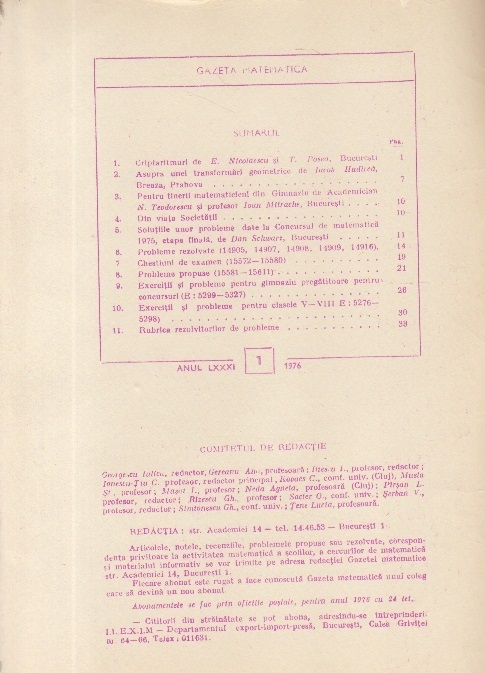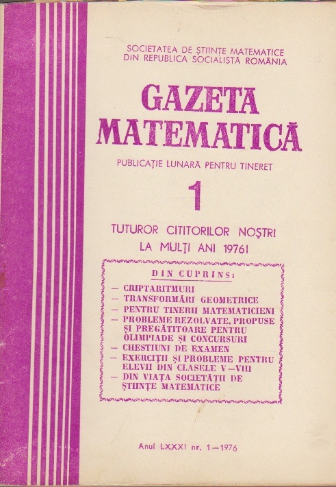 Comandă online cartea "Gazeta Matematica, Nr. 1 - Ianuarie 1976" la 6,20 lei scrisă de Societatea de Stiinte Matematice din Romania, tiparită la editura Gazeta Matematica face parte din colecția Gazeta Matematica în anul 1976. Livrare din stoc cu plata ramburs sau online cu cardul.