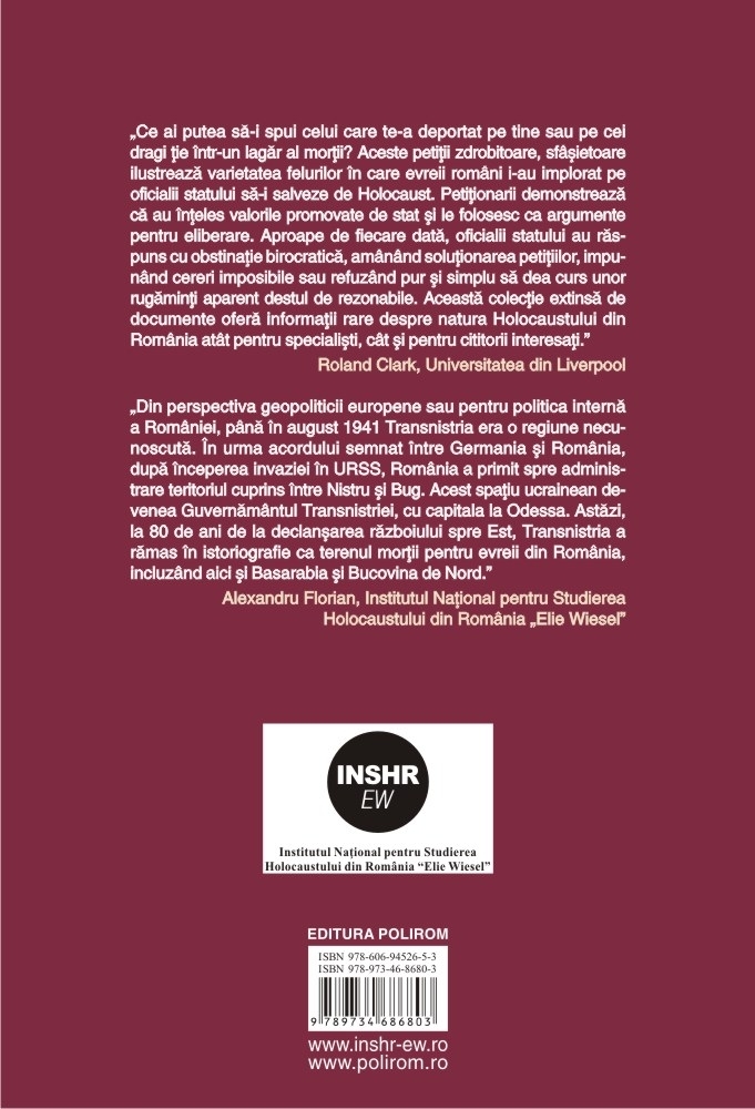 „Ce ai putea să-i spui celui care te-a deportat pe tine sau pe cei dragi ție într-un lagăr al morții? Aceste petiții zdrobitoare, sfâșietoare ilustrează varietatea felurilor în care evreii români i-au implorat pe oficialii statului să-i salveze de Holocaust. Petiționarii demonstrează că au înțeles valorile promovate de stat și le folosesc ca argumente pentru eliberare. Aproape de fiecare dată, oficialii statului au răspuns cu obstinație birocratică, amânând soluționarea petițiilor, impunând cereri imposibile sau refuzând pur și simplu să dea curs unor rugăminți aparent destul de rezonabile. Această colecție extinsă de documente oferă informații rare despre natura Holocaustului din România atât pentru specialiști, cât și pentru cititorii interesați.” (Roland Clark, Universitatea din Liverpool)