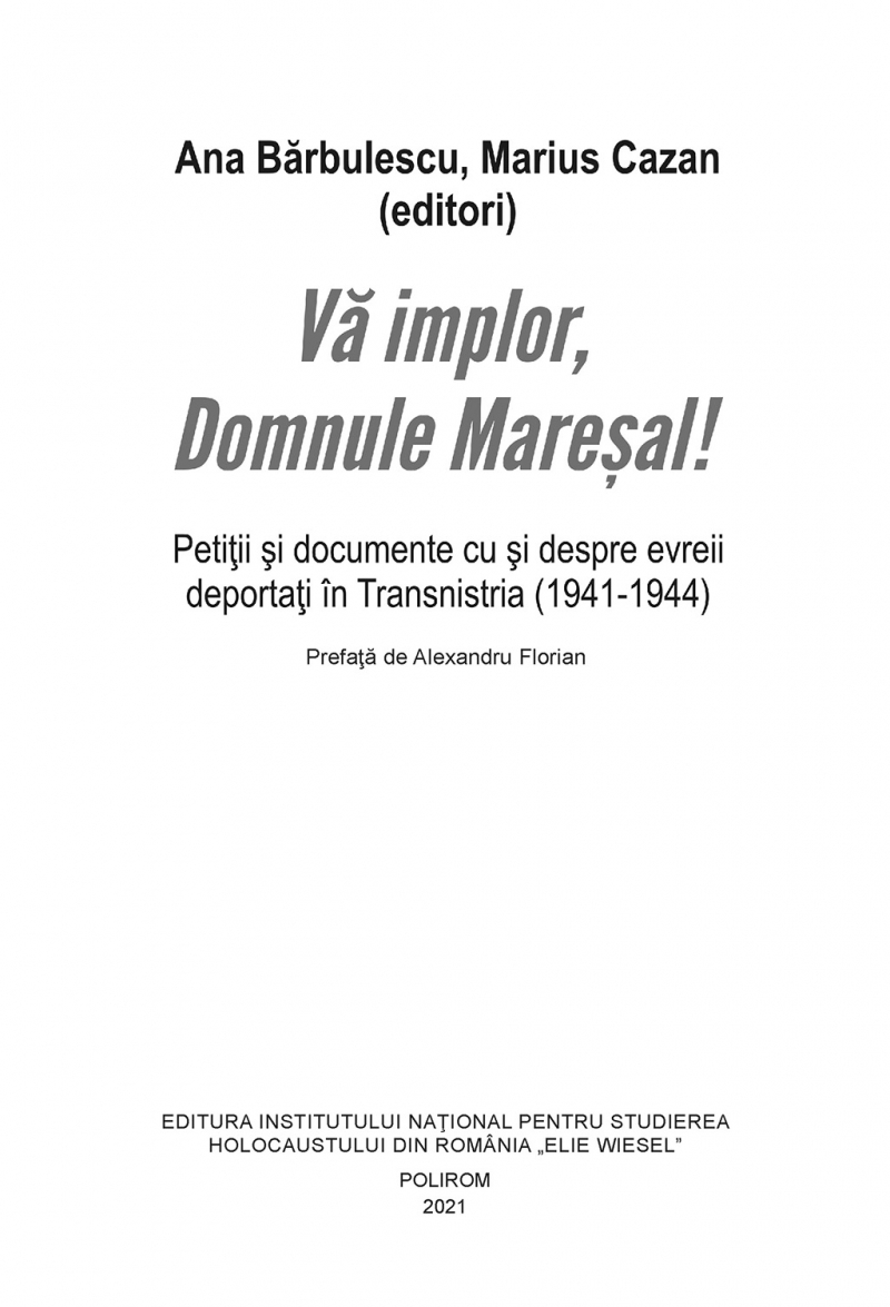 Comandă online cartea "Vă implor, Domnule Mareșal! Petiții și documente cu și despre evreii deportați în Transnistria (1941-1944)" la 52,80 lei isbn 9789734686803 scrisă de Ana Barbulescu , Marius Cazan, tiparită la editura Polirom face parte din colecția -. Cartea poate fi livrată în circa 5 zile cu plata ramburs sau online cu cardul.