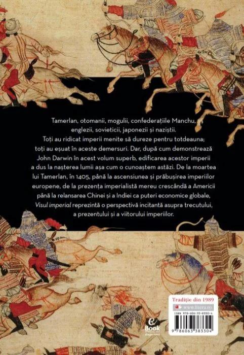 Tamerlan, otomanii, mogulii, confederațiile Manchu, englezii, sovieticii, japonezii și naziștii. Toți au ridicat imperii menite să dureze pentru totdeauna; toți au eșuat în aceste demersuri. Dar, după cum demonstrează John Darwin în acest volum superb, edificarea acestor imperii a dus la nașterea lumii așa cum o cunoaștem astăzi. De la moartea lui Tamerlan, în 1405, până la ascensiunea și prăbușirea imperiilor europene, de la prezența imperialistă mereu crescândă a Americii până la relansarea Chinei și a Indiei ca puteri economice globale, Visul imperial reprezintă o perspectivă incitantă asupra trecutului, a prezentului și a viitorului imperiilor.