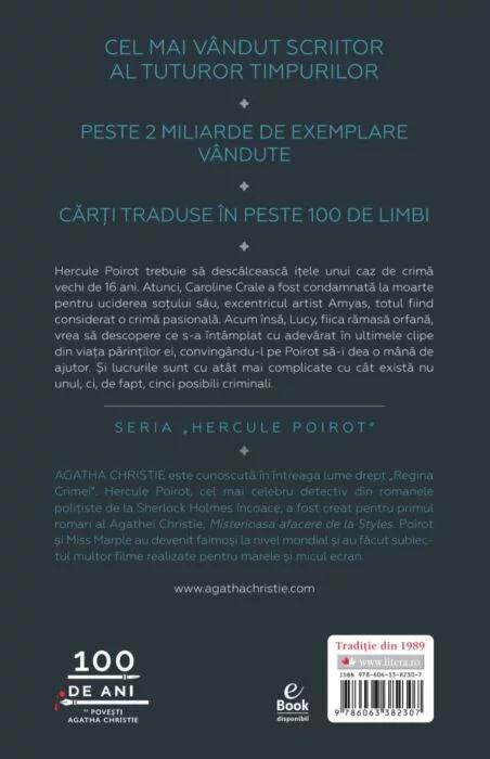Hercule Poirot trebuie să descâlcească ițele unui caz de crimă vechi de 16 ani. Atunci, Caroline Crale a fost condamnată la moarte pentru uciderea soțului său, excentricul artist Amyas, totul fiind considerat o crimă pasională. Acum însă, Lucy, fiica rămasă orfană, vrea să descopere ce s-a întâmplat cu adevărat în ultimele clipe din viața părinților ei, convingându-l pe Poirot să-i dea o mână de ajutor. Și lucrurile sunt cu atât mai complicate cu cât există nu unul, ci, de fapt, cinci posibili criminali.