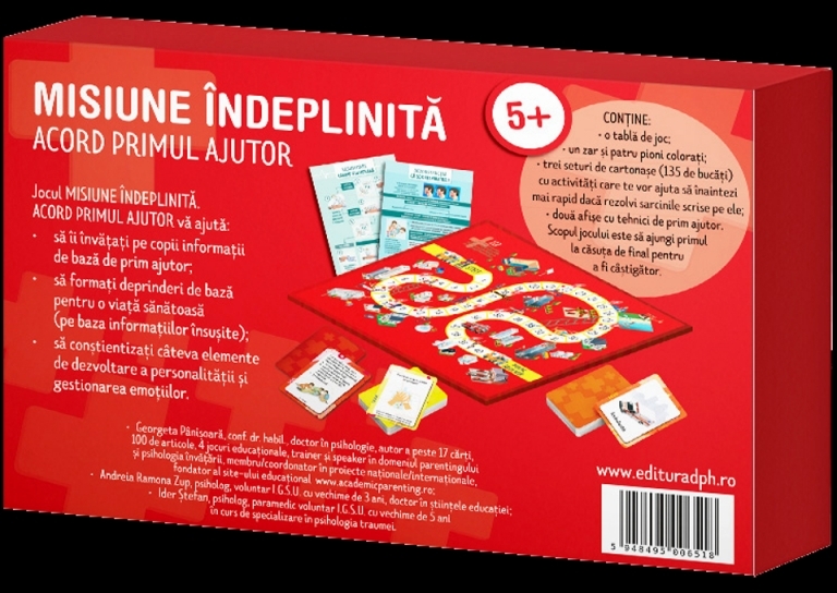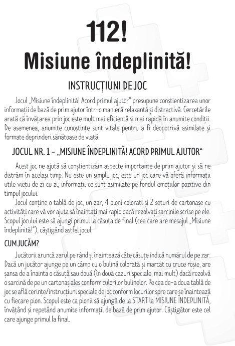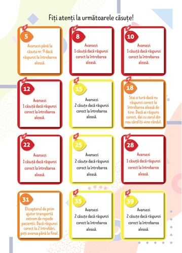 Jocul conține: o tablă de joc, un zar și patru pioni colorați, trei seturi de cartonașe (135 de bucăți) cu activități care te vor ajuta să înaintezi mai rapid dacă rezolvi sarcinile scrise pe ele și două afișe cu tehnici de prim ajutor.
