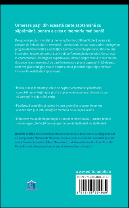 De opt ori campion mondial la memorie, Dominic O’Brien vă oferă cursul său complet de îmbunătăţire a memoriei – conducându-vă pas cu pas printr-un ingenios program de îmbunătăţire a abilităţilor. Dominic împărtăşeşte toate tehnicile sale încercate şi testate pe care şi-a construit performanţele de campion. Cursul este în concordanţă cu înţelegerea expertă a lui Dominic despre modul în care creierul răspunde la antrenamentul de bază în memorare şi este organizat în 50 de paşi, unde veți găsi strategii şi sfaturi despre cum să vă extindeți capacităţile mentale într-un ritm realist, dar impresionant.