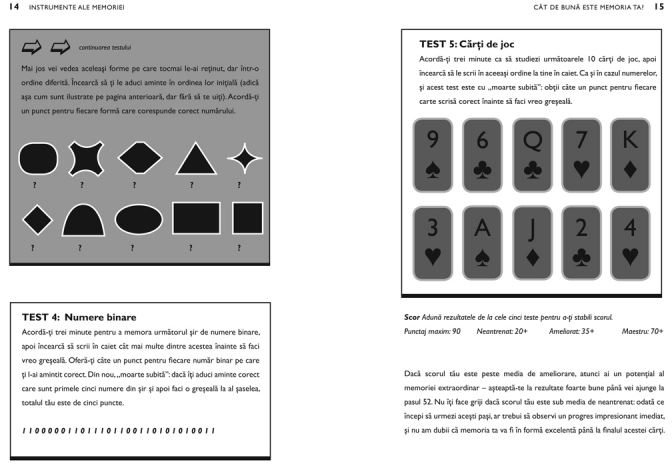 Pentru a profita la maximum de această carte, autorul recomandă să efectuați exerciţiile şi testele care sunt cuprinse în majoritatea etapelor. Puteți repeta exerciţiile şi testele de câte ori doriți: memoria este o facultate care este întotdeauna îmbunătăţită prin exerciţiu. Exerciţiile şi testele nu doar că vă vor ajuta să memorați anumite tipuri de informaţie, ci vă vor îmbunătăți memoria în general.