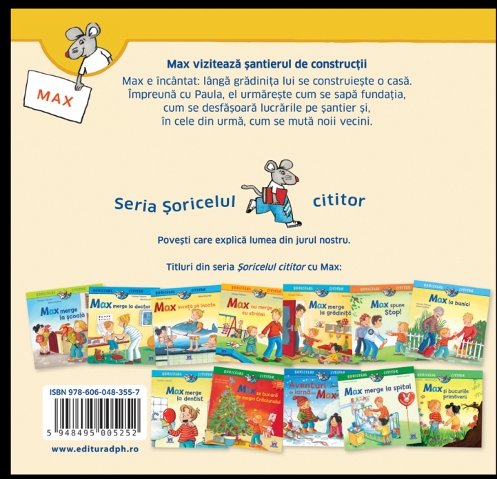 Max vizitează șantierul de construcții face parte din seria Șoricelul cititor – povești care explică lumea din jurul nostru și se adresează tuturor copiilor cu vârsta peste 3 ani.