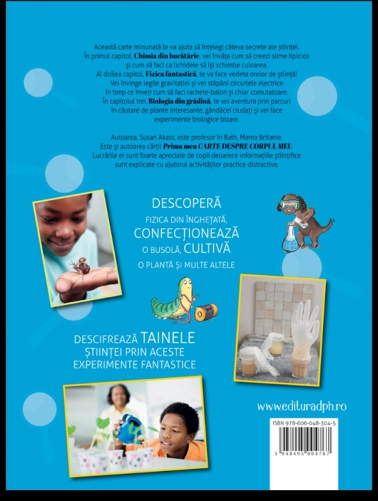 Această carte minunată te va ajuta să înţelegi câteva secrete ale științei. În primul capitol, Chimia din bucătărie, vei învăţa cum să creezi slime lipicios şi cum să faci ca lichidele să îşi schimbe culoarea. Al doilea capitol, Fizica fantastică, te va face vedeta orelor de ştiinţă. Vei învinge legile gravitaţiei şi vei stăpâni circuitele electrice în timp ce înveţi cum să faci rachete-balon şi chiar comutatoare. În capitolul trei, Biologia din grădină, te vei aventura prin parcuri în căutare de plante interesante, gândăcei ciudaţi şi vei face experimente biologice bizare.