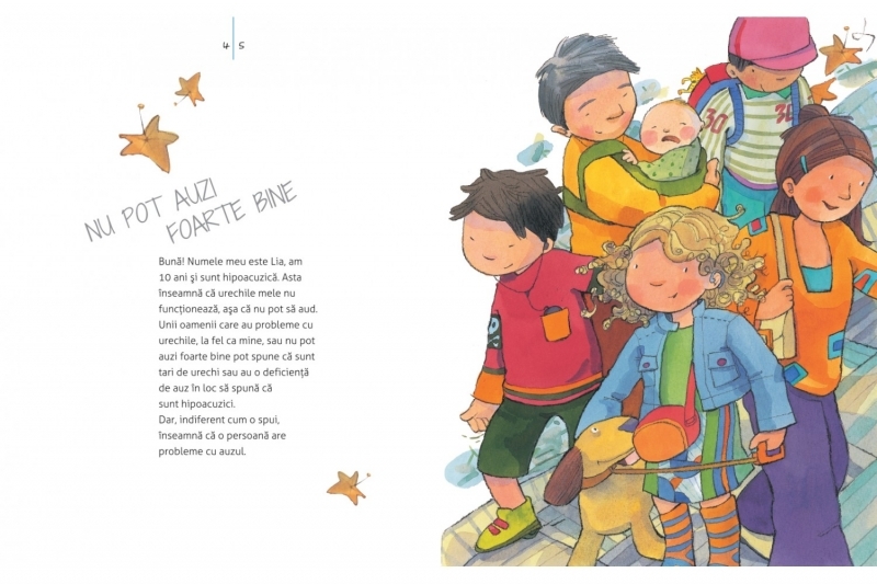 Lia are 10 ani şi este hipoacuzică. În această carte, Lia povestește despre cum este să fii hipoacuzică şi despre lucrurile care o ajută să înveţe la şcoală şi să comunice cu alţii.