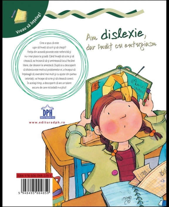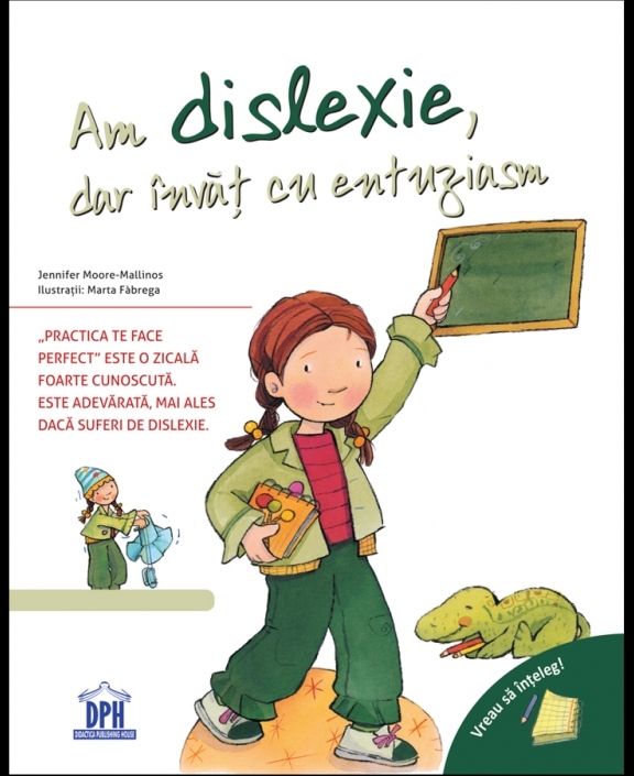 Cartea Am dislexie, dar învăț cu entuziasm face parte din seria „Vreau să înțeleg” și vă prezintă povestea unei fetițe care avea dificultăți de scriere și citire.