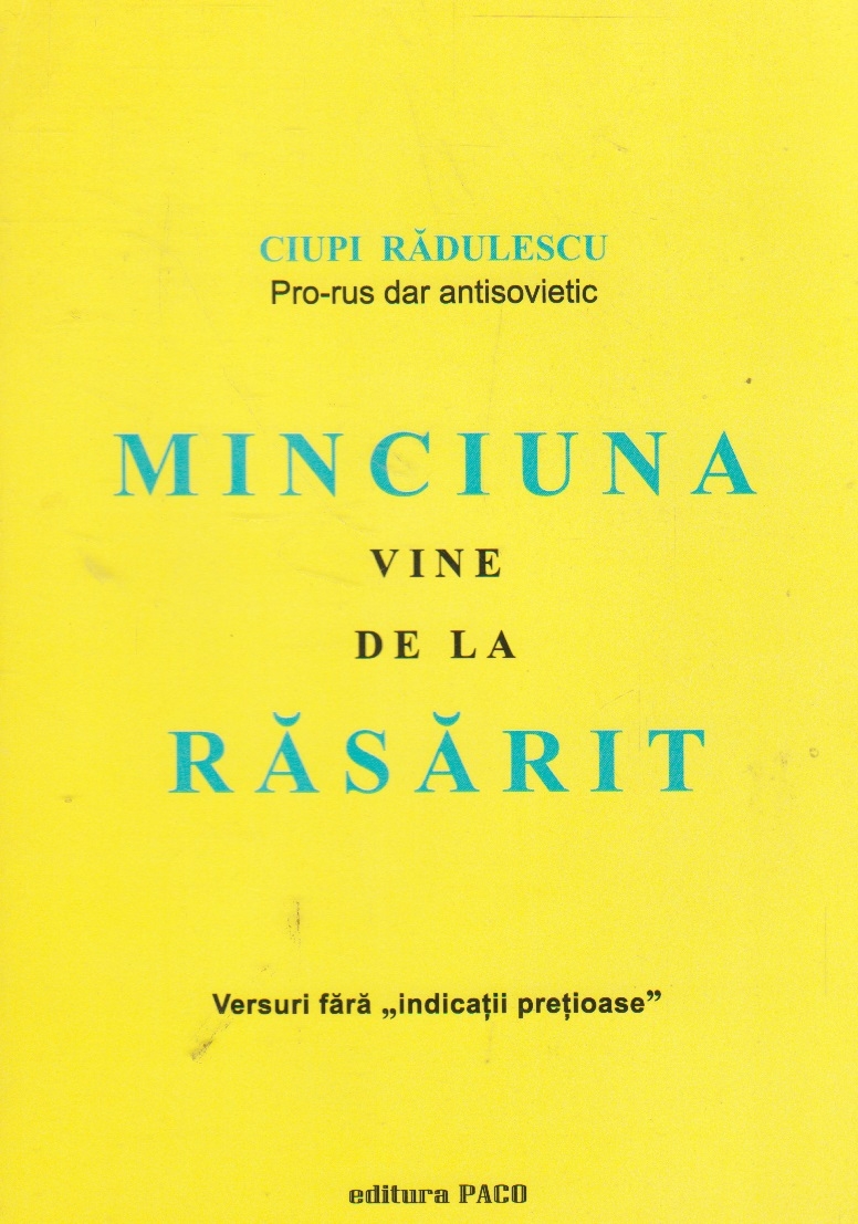 Comandă online Minciuna vine de la rasarit. Versuri fara indicatii pretioase la 6,20 lei scrisă de Ciupi Radulescu, tiparită la editura Paco cu un număr de 105 pagini categorie Poezie, Beletristică și critică. cu plata ramburs sau online cu cardul. Momentan titlul Minciuna vine de la rasarit. Versuri fara indicatii pretioase nu este disponibil însa vă puteți înscrie pentru a fi notificat în momenul reaprovizionarii.