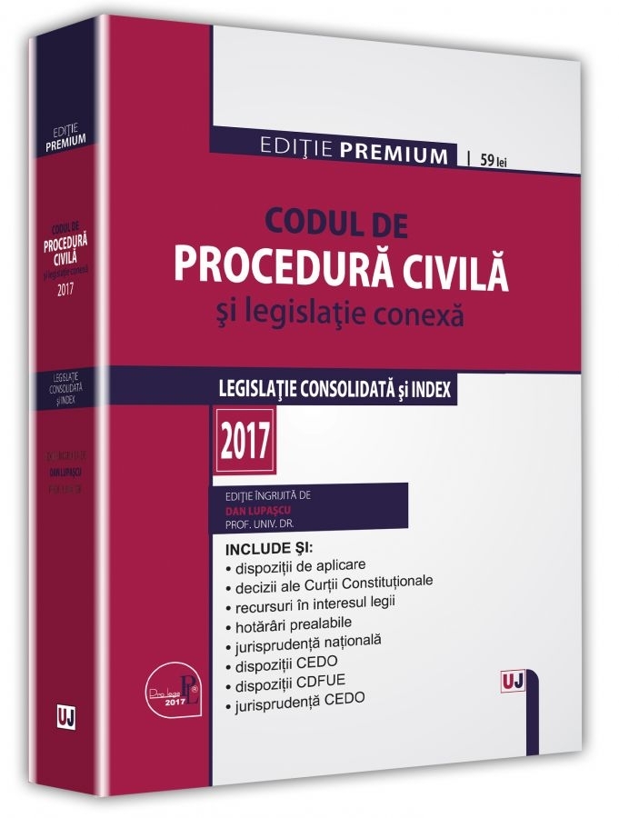 Comandă online Codul de procedura civila si legislatie conexa 2017. Editie Premium la 62,40 lei isbn 9786063900587 scrisă de Dan Lupascu, tiparită la editura Universul Juridic în anul 2017. Cartea poate fi livrată în circa 2 zile cu plata ramburs sau online cu cardul.