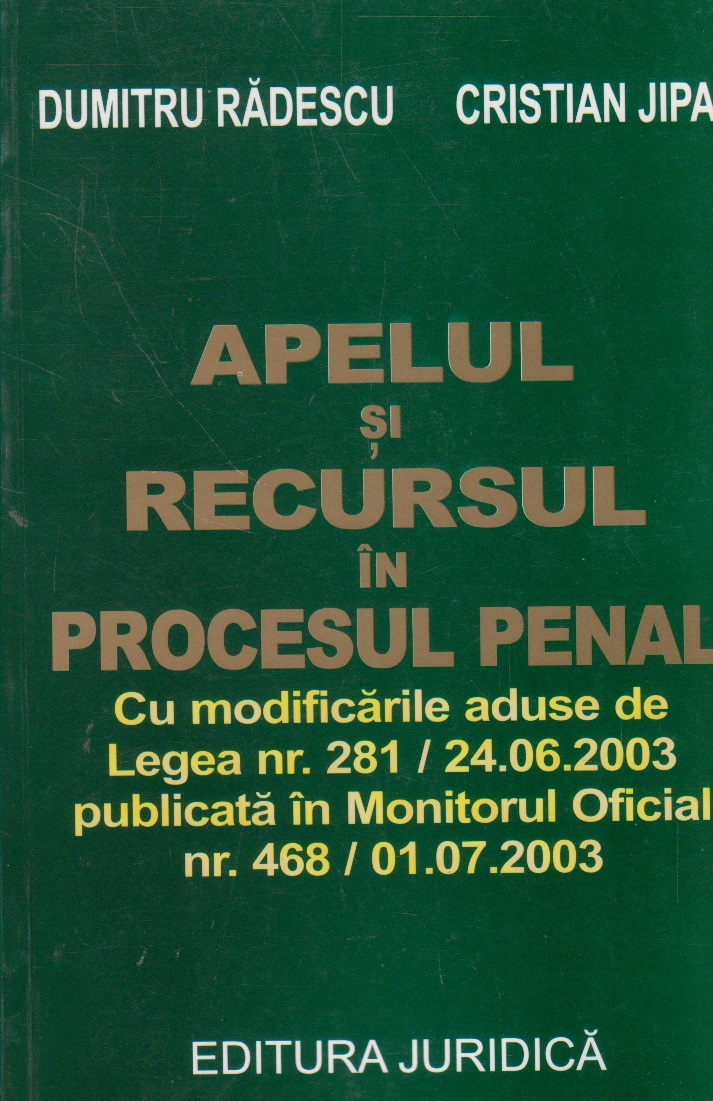 Comandă online Apelul si recursul in procesul penal. Cu modificarile aduse de Legea nr. 281/24.06.2003 la 30,70 lei scrisă de Dumitru Radescu, tiparită la editura Juridica cu un număr de 532 pagini categorie Penal, Drept. cu plata ramburs sau online cu cardul. Momentan titlul Apelul si recursul in procesul penal. Cu modificarile aduse de Legea nr. 281/24.06.2003 nu este disponibil însa vă puteți înscrie pentru a fi notificat în momenul reaprovizionarii.