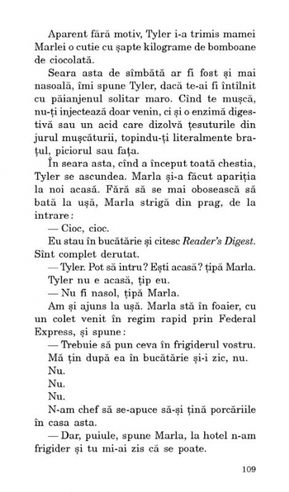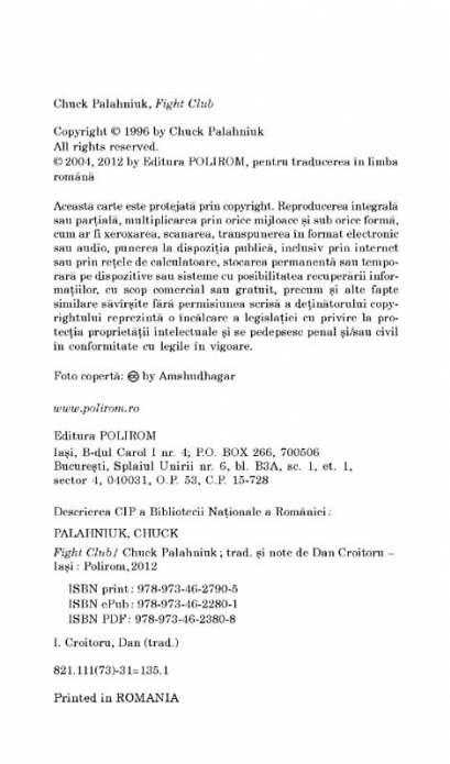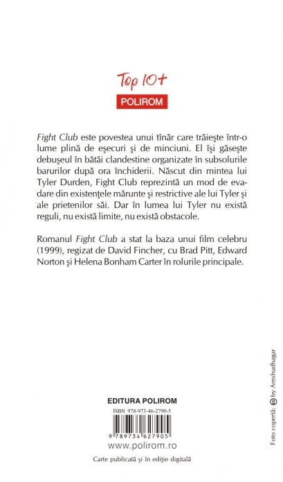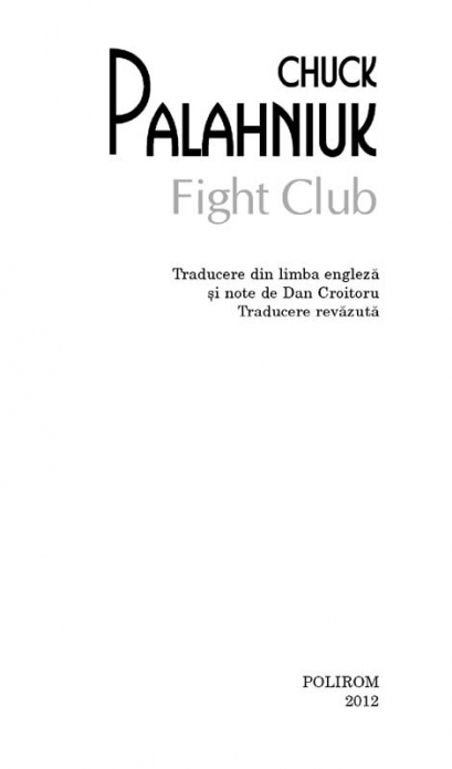 Traducere din limba engleza si note de Dan Croitoru Traducere revazuta Publicat in 1996 si devenit un clasic al literaturii underground, Fight Club este unanim considerat in momentul de fata unul dintre cele mai originale si provocatoare romane scrise in ultimul deceniu al secolului XX. Fight Club este povestea unui tinar care traieste intr-o lume plina de esecuri si de minciuni. El isi gaseste debuseul in batai clandestine organizate in subsolurile barurilor dupa ora inchiderii. Nascut din mintea lui Tyler Durden, Fight Club reprezinta un mod de evadare din existentele marunte si restrictive ale lui Tyler si ale prietenilor sai. Dar in lumea lui Tyler nu exista reguli, nu exista limite, nu exista obstacole. Romanul Fight Club a stat la baza unui film celebru (1999), regizat de David Fincher, cu Brad Pitt, Edward Norton si Helena Bonham Carter in rolurile principale. „Caustic, atroce, violent si nelinistitor, Fight Club nu va va lasa nici o clipa in pace.” (Publishers Weekly) „Aceasta stralucita mostra de nihilism are ceva in plus fata de atitea alte romane care se autodenumesc periculoase: Fight Club este periculos prin faptul ca nu-l poti lasa din mina!” (Kirkus Reviews)