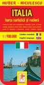 De notorietate pentru vestigiile Antichitatii si cele ale Evului Mediu, de o diversitate culturala si geografica greu de egalat, pentru romani chiar tara de bastina a unora dintre stramosii lor ("... de la Ram ne tragem..."), Italia beneficiaza de o reprezentare in doua sectiuni, fata/verso (pentru a raspunde unei detalieri cartografice de anvergura, la scara de 1 : 900 000, cu o evidentiere cartografica a insulelor Sicilia si Sardinia, si acestea teritorii cu potential turistic). Indicand drumurile europene, drumurile nationale, autostrazile cu nod rutier si tunel/cele aflate in constructie, soselele cu limita de viteza cu tunel/cele aflate in constructie, drumurile nationale cu tunel/cele aflate in constructie, principale, secundare cu tunel (dar si alte drumuri, printre care chiar si cele comunale), caile ferate, toate insotite de mentionarea distantei in kilometri, harta asigura consultantilor ei, chiar celor mai "inraiti" dintre turisti, un bagaj informativ consistent (forme de relief, zone administrative, granite, localizari de aeroporturi, porturi, feriboturi benzinarii, plaje, moteluri, campinguri, pesteri, parcuri si rezervatii naturale, gradini zoologice/botanice, monumente din Patrimoniul cultural UNESCO, lacasuri de cult, castele) si este insotita de un INDICE DE ORIENTARE RAPIDA ASUPRA LOCALITATILOR, cu trimiteri la coordonatele hartii.