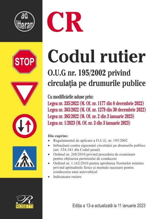 Comandă online cartea "Codul rutier : O.U.G. nr. 195/2002 privind circulaţia pe drumurile publice" la 43,01 lei isbn 9786060251118, tiparită la editura Rosetti în anul 2023 cu un număr de 304 pagini. cu plata ramburs sau online cu cardul. Momentan titlul "Codul rutier : O.U.G. nr. 195/2002 privind circulaţia pe drumurile publice" nu este disponibil însa vă puteți înscrie pentru a fi notificat în momenul reaprovizionarii.