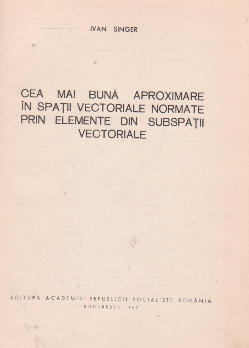 Comandă online Cea mai buna aproximare in spatii vectoriale normate prin elemente din subspatii vectoriale la 51,80 lei scrisă de Ivan Singer, tiparită la editura Academiei Republicii Socialiste Romania în anul 1967 cu un număr de 386 pagini. Livrare din stoc cu plata ramburs sau online cu cardul.