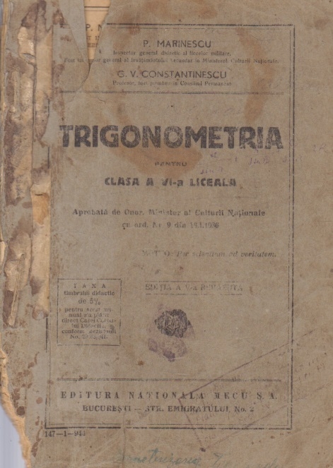 Comandă online cartea "Trigonometria pentru clasa a VI-a liceala (Editie 1944)" la 30,70 lei scrisă de P. Marinescu , G. V. Constantinescu, tiparită la editura Nationala Gh Mecu în anul 1944 cu un număr de 201 pagini. cu plata ramburs sau online cu cardul. Momentan titlul "Trigonometria pentru clasa a VI-a liceala (Editie 1944)" nu este disponibil însa vă puteți înscrie pentru a fi notificat în momenul reaprovizionarii.