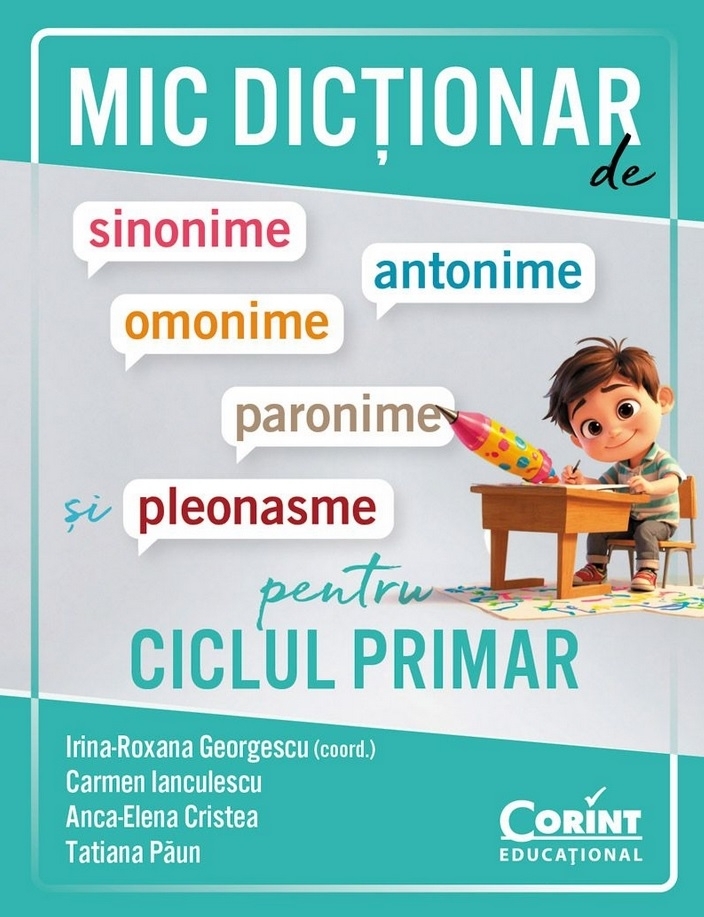 Comandă online cartea "Mic dicţionar de sinonime, antonime, omonime, paronime, pleonasme pentru ciclul primar" la 41,25 lei isbn 9786303610825 scrisă de Irina-Roxana Georgescu (coord.) , Carmen Ianculescu , Anca-Elena Cristea , Tatiana Paun , Irina-Roxana Georgescu, tiparită la editura Corint în anul 2025. Cartea poate fi livrată în circa 2 zile cu plata ramburs sau online cu cardul.