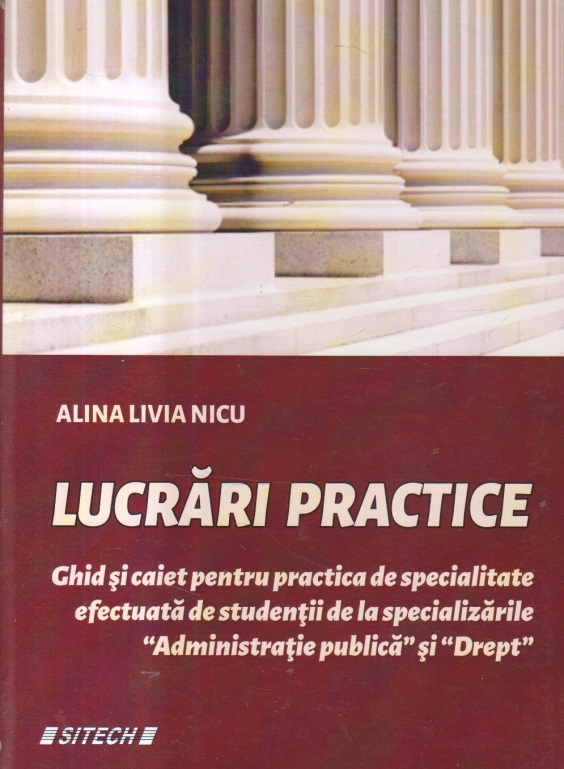 Comandă online cartea "Lucrari practice - Ghid si caiet pentru practica de specialitate efectuata de studentii de la specializarile Administratie publica si Drept" la 10,50 lei scrisă de Alina Livia Nicu, tiparită la editura Sitech în anul 2016 cu un număr de 77 pagini. Livrare din stoc cu plata ramburs sau online cu cardul.