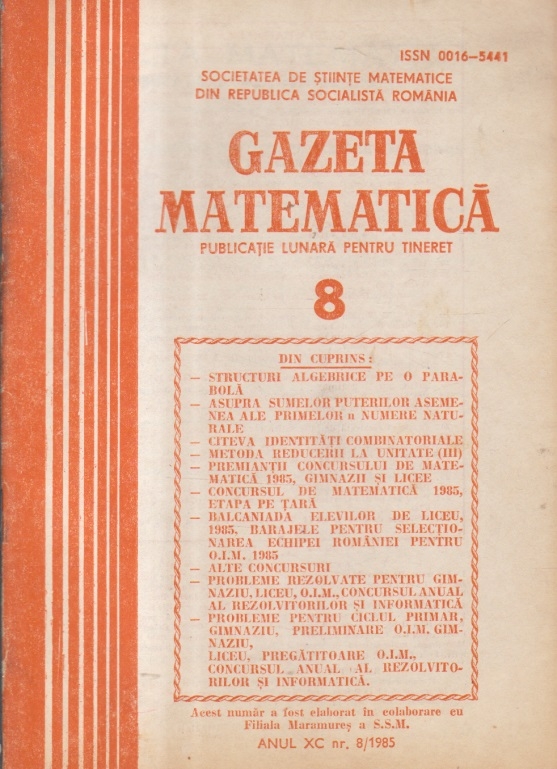 Comandă online cartea "Gazeta Matematica Nr. 8/1985" la 5,20 lei scrisă de Societatea de Stiinte Matematice din Romania, tiparită la editura Gazeta Matematica face parte din colecția Gazeta Matematica în anul 1985. Livrare din stoc cu plata ramburs sau online cu cardul.