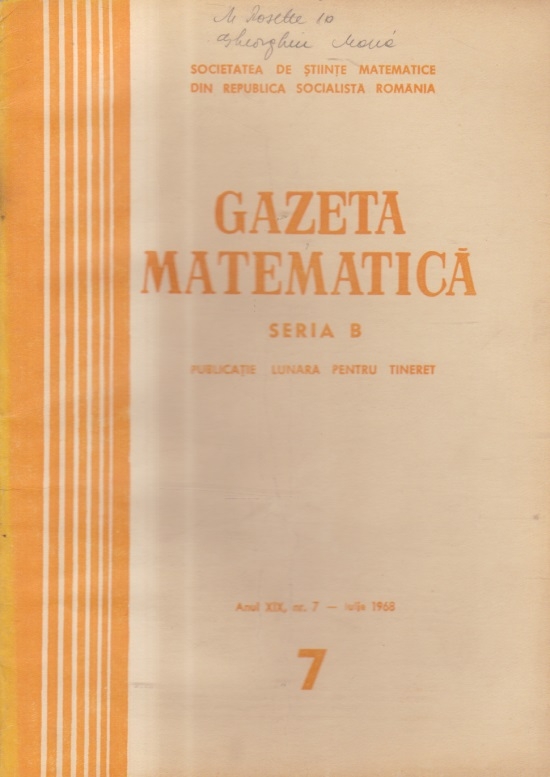 Comandă online cartea "Gazeta Matematica, Nr. 7/1968" la 6,20 lei scrisă de Societatea de Stiinte Matematice din Romania, tiparită la editura Gazeta Matematica face parte din colecția Gazeta Matematica în anul 1968. Livrare din stoc cu plata ramburs sau online cu cardul.