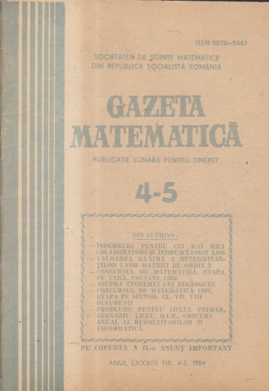 Comandă online cartea "Gazeta Matematica, Nr. 4-5/1984" la 12,90 lei scrisă de Societatea de Stiinte Matematice din Romania, tiparită la editura Gazeta Matematica face parte din colecția Gazeta Matematica în anul 1984. Livrare din stoc cu plata ramburs sau online cu cardul.