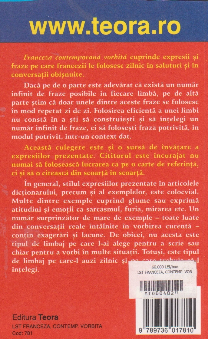Franceza contemporana vorbita cuprinde o culegere de baza de expresii si fraze pe care francezii le folosesc zilnic in saluturi si in conversatii obisnuite. Daca pe de o parte este adevarat ca exista un numar infinit de fraze posibile in fiecare limba, pe de alta parte stim ca doar unele dintre aceste fraze se folosesc in mod repetat zi de zi. Folosirea eficienta a unei limbi nu consta in a sti sa construiesti si sa intelegi un numar infinit de fraze, ci sa folosesti fraza potrivita, in modul potrivit, intr-un context dat. Aceasta culegere este si o sursa de invatare a expresiilor prezentate. Cititorul este incurajat nu numai sa foloseasca lucrarea ca pe o carte de referinta, ci si sa o citeasca din scoarta in scoarta. In general, stilul expresiilor prezentate in articolele dictionarului, precum si al exemplelor, este colocvial. Multe dintre exemple cuprind glume sau exprima atitudini si emotii ca sarcasmul, furia, mirarea etc. Un numar surprinzator de mare de exemple - toate luate din conversatii reale intalnite in vorbirea curenta - contin exagerari si lacune. De obicei, nu acesta este tipul de limbaj pe care I-ai alege pentru a scrie sau chiar pentru a vorbi in multe situatii. Totusi, este tipul de limbaj pe care-I auzi zilnic si pe care trebuie sa-I intelegi. Contine: 136 pagini