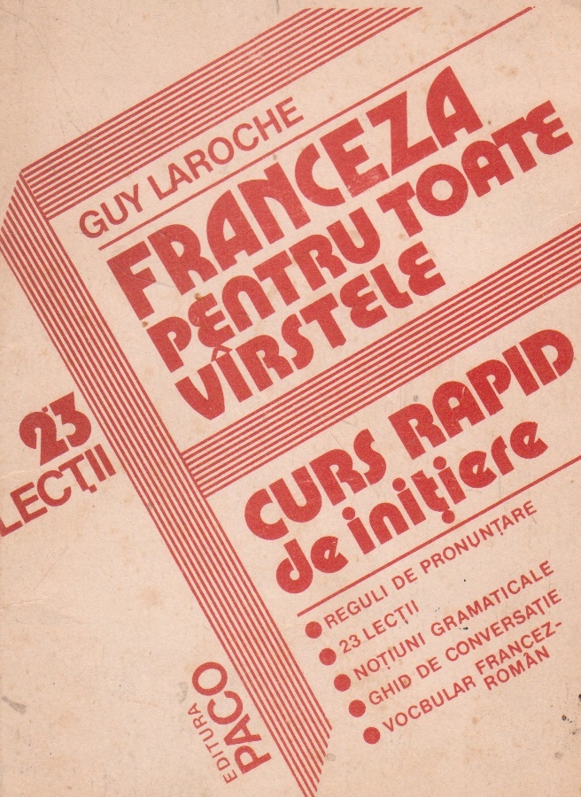 Comandă online Franceza pentru toate varstele (curs rapid de initiere) la 10,60 lei scrisă de Guy Laroche, tiparită la editura Paco în anul 1992 cu un număr de 126 pagini. Livrare din stoc cu plata ramburs sau online cu cardul.