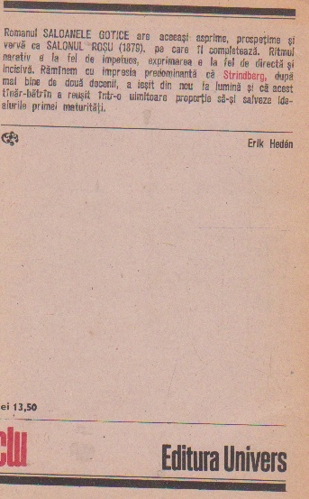 Comandă online Saloanele gotice la 4,95 lei scrisă de August Strindberg, tiparită la editura Univers face parte din colecția Clasicii Literaturii Universale în anul 1987. Livrare din stoc cu plata ramburs sau online cu cardul.