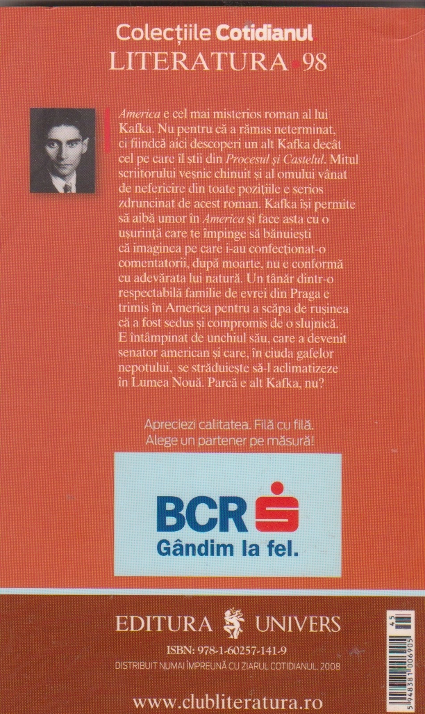 A lăsat o bogată corespondenţă cu Milena Jasenska, una dintre marile sale iubiri, un jurnal generos şi multe carnete cu însemnări, parte dintre ele pierdute după ce au fost confi scate de Gestapo, în timpul ocupaţiei fasciste. Flaubert a fost autorul pe care l-a iubit cel mai mult. America nu seamănă nici cu Procesul(1925) şi nici cu Castelul (1926). E o carte neterminată care dezvăluie un Kafka racordat la viaţa, la culorile şi la umorul străzii, un Kafka picaresc care scrie despre un puşti evreu, trimis de rude în SUA ca să se potolească după ce-i sucise minţile menajera. Cât a lucrat la roman avea de gând să-i pună titlul Der Verschollene (Omul dispărut). A publicat doar un capitol în timpul vieţii, în 1913 şi doar primele şase poartă titlurile alese de el. Tot Max Brod a fost cel care s-a ocupat de editare după moartea prietenului său şi romanul a apărut în 1927.
