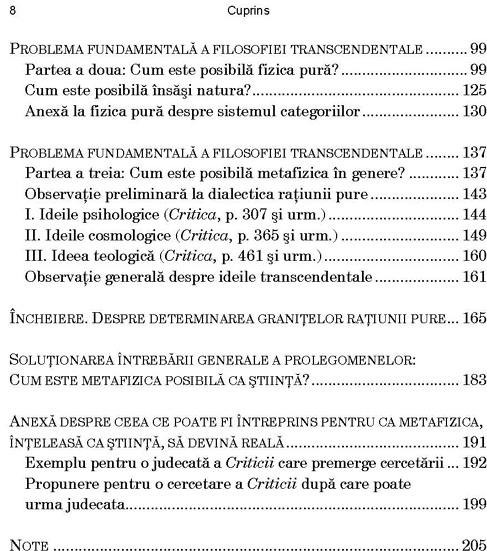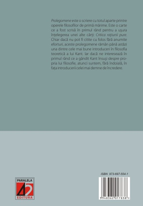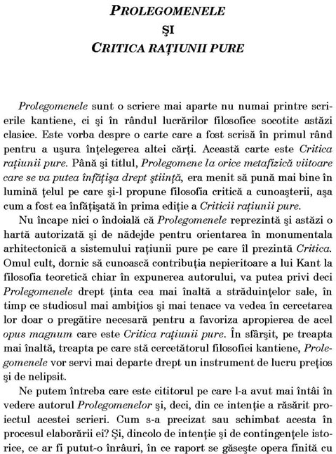 Prolegomene la orice metafizica viitoare care se va putea infatisa drept stiinta reprezinta o scriere cu totul aparte printre operele filosofilor de prima marime. Este o carte ce a fost conceputa in primul rand pentru a usura intelegerea unei alte carti, Critica ratiunii pure. Chiar daca nu pot fi citite cu folos fara anumite eforturi, aceste Prolegomene raman pana astazi una dintre cele mai bune introduceri in filosofia teoretica a lui Kant. Iar daca ne intereseaza in primul rand ce a gandit Kant, atunci suntem, fara indoiala, in fata introducerii celei mai demne de incredere.