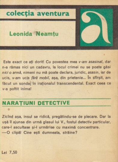 Comandă online Naratiuni detective - intr-un tempo clasic, monoton la 10,50 lei scrisă de Leonida Neamtu, tiparită la editura Albatros face parte din colecția Aventura în anul 1978. Livrare din stoc cu plata ramburs sau online cu cardul.