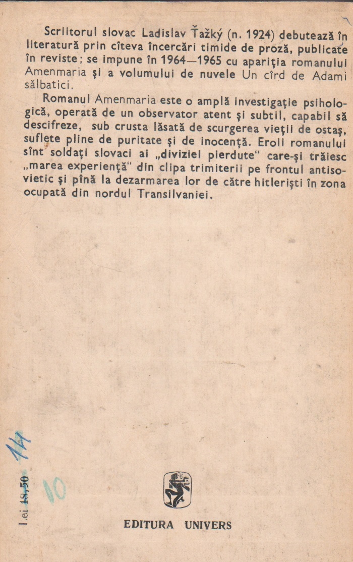 Comandă online Amenmaria - Soldati unul si unul la 6,45 lei scrisă de Ladislav Tazky, tiparită la editura Univers în anul 1970 cu un număr de 635 pagini. Livrare din stoc cu plata ramburs sau online cu cardul.