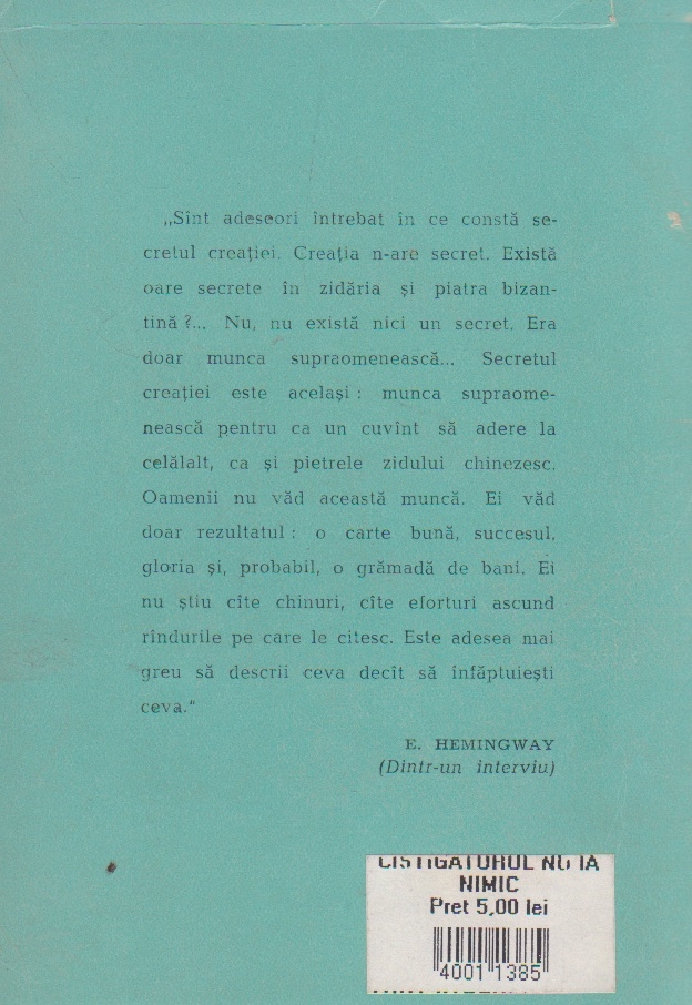 Comandă online Cistigatorul nu ia nimic la 10,50 lei scrisă de Ernest Hemingway, tiparită la editura Pentru Literatura face parte din colecția Biblioteca pentru toti în anul 1964. Livrare din stoc cu plata ramburs sau online cu cardul.