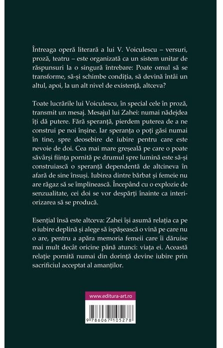All Voiculescu’s work, but especially his prose, transmits a message. It is Zahei’s message: only despair gives strength. Without hope, one loses the strength to build oneself. And hope can only be found within oneself, unlike love, which needs two. Once set on the path towards the light, the greatest mistake one can make is to build hope dependent on someone else other than oneself. The love between man and woman has no time to come full circle. Starting with a burst of sensuality, the two will part ways before internalization happens.