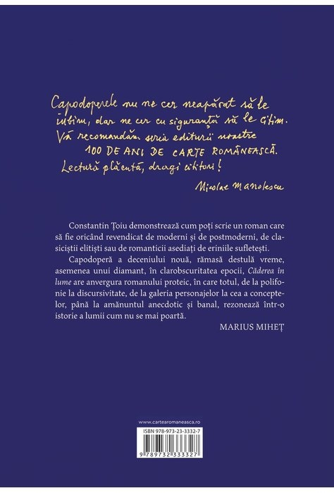 Comandă online Căderea în lume. Ediția a V-a la 49,00 lei isbn 9789732333327 scrisă de Constantin Toiu , Constantin Țoiu, tiparită la editura Art face parte din colecția Cartea Românească 100. Cartea poate fi livrată în circa 2 zile cu plata ramburs sau online cu cardul.