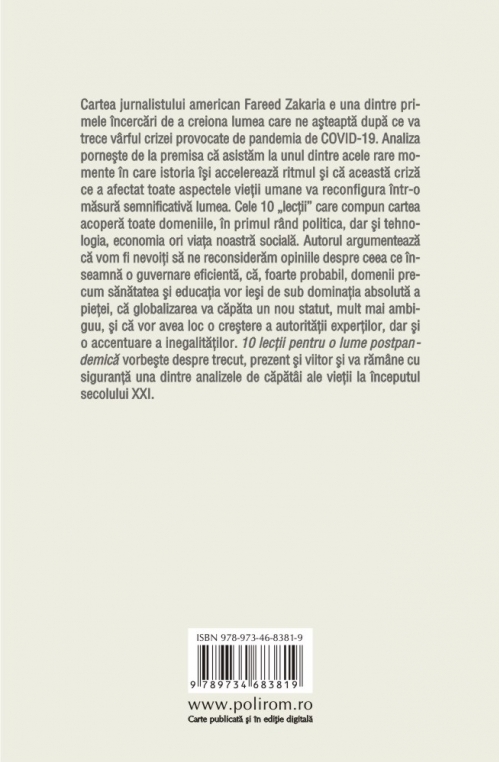 Cartea jurnalistului american Fareed Zakaria e una dintre primele încercări de a creiona lumea care ne aşteaptă după ce va trece vîrful crizei provocate de pandemia de COVID-19. Analiza porneşte de la premisa că asistăm la unul dintre acele rare momente în care istoria îşi accelerează ritmul şi că această criză ce a afectat toate aspectele vieţii umane va reconfigura într-o măsură semnificativă lumea. Cele 10 „lecţii” care compun cartea acoperă toate domeniile, în primul rînd politica, dar şi tehnologia, economia ori viaţa noastră socială. Autorul argumentează că vom fi nevoiţi să ne reconsiderăm opiniile despre ceea ce înseamnă o guvernare eficientă, că, foarte probabil, domenii precum sănătatea şi educaţia vor ieşi de sub dominaţia absolută a pieţei, că globalizarea va căpăta un nou statut, mult mai ambiguu, şi că vor avea loc o creştere a autorităţii experţilor, dar şi o accentuare a inegalităţilor. 10 lecţii pentru o lume postpandemică vorbeşte despre trecut, prezent şi viitor şi va rămîne cu siguranţă una dintre analizele de căpătîi ale vieţii la începutul secolului XXI.