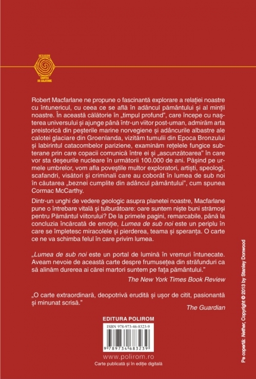Dintr-un unghi de vedere geologic asupra planetei noastre, Macfarlane pune o întrebare vitală și tulburătoare: oare sîntem niște buni strămoși pentru Pămîntul viitorului? De la primele pagini, remarcabile, pînă la concluzia încărcată de emoție, Lumea de sub noi este un periplu în care se împletesc miracolele și pierderea, teama și speranța. O carte ce ne va schimba felul în care privim lumea.