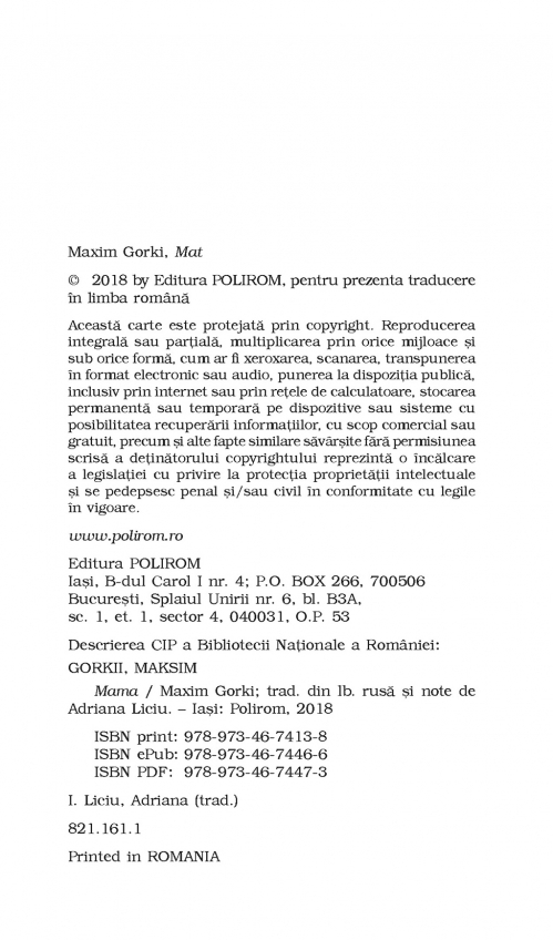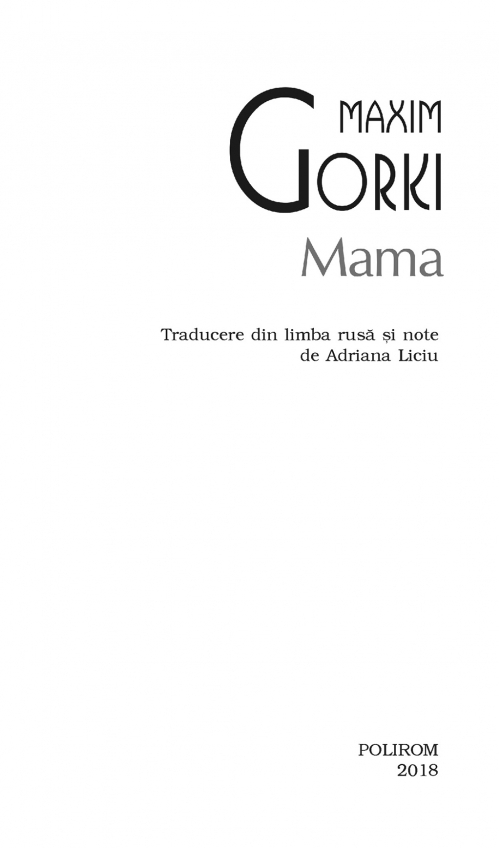 Comandă online Mama (ediţie de buzunar) la 10,60 lei isbn 9789734674138 scrisă de Maxim Gorki, tiparită la editura Polirom face parte din colecția Top 10+. Cartea poate fi livrată în circa 2 zile cu plata ramburs sau online cu cardul.
