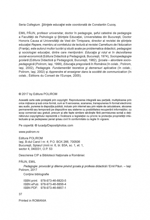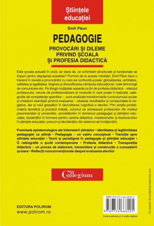 Este şcoala actuală în criză, iar dacă da, ce schimbări structurale şi funcţionale se impun pentru depăşirea acesteia? Pornind de la aceste întrebări, Emil Păun face o trecere în revistă a provocărilor cu care se confruntă şcoala: globalizarea, echitatea, calitatea şi egalitatea, lărgirea şi diversificarea cîmpului educaţional, noile tehnologii de comunicare etc. Pe lîngă multiplele aspecte ce ţin de profesia didactică – statutul profesorului, nevoia de profesionalizare şi modurile în care poate fi realizată, categoriile de competenţe specifice –, sînt analizate transformările curriculumului şcolar şi chestiuni esenţiale privind evaluarea – obsesia rezultatelor şi consecinţele ei negative, dar şi rolul greşelilor în dezvoltarea cognitivă a elevilor. Prin ampla problematică teoretică şi practică tratată, volumul se adresează profesorilor din mediul preuniversitar şi universitar, cercetătorilor în domeniul pedagogiei şi ştiinţelor educaţiei, studenţilor în formare pentru cariera didactică, masteranzilor şi doctoranzilor în ştiinţele educaţiei, precum şi decidenţilor din sistemul de învăţămînt.