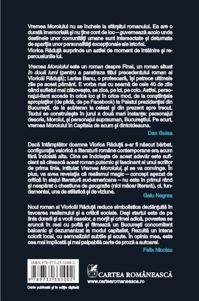 Vremea Moroiului nu se incheie la sfirsitul romanului. Ea are o durata imemoriala si nu tine cont de loc – guverneaza acolo unde destinele unor comunitati umane sunt intersectate si deturnate de aparitia unor personalitati exceptionale ale istoriei. Viorica Raduta surprinde un astfel de moment de intilnire si repercusiunile lui. „Vremea Moroiului este un roman despre Final, un roman situat in doua lumi (pentru a parafraza titlul precedentului roman al Vioricai Raduta); Larisa Banu, o profesoara, isi petrece ultimele zile pe acest pamint. E vorba mai cu seama de cele 40 de zile cind sufletul mai zaboveste, se zice, pe ici, pe colo. Astfel, personajul-liant accede in orice loc si in orice mod, de la constiintele apropiatilor (de pilda, de pe Facebook) la Palatul prezidential din Bucuresti, de la subteran la celest si din prezent spre trecut. Textul se construieste in jurul a doua mari instante: personajul descris, Moroiul, si personajul suprauman, Bucurestiul. Pe scurt, vremea Moroiului in Capitala de acum si dintotdeauna.” (Dan Gulea) „Daca intimplator doamna Viorica Raduta s-ar fi nascut barbat, configuratia valorica a literaturii romane contemporane era acum fara indoiala alta. Cine se indoieste de acest adevar este suficient sa citeasca acest roman puternic si fascinant al unui scriitor de prima linie, intitulat Vremea Moroiului, si se va convinge. In plus, va avea revelatia ca realismul magic – concept asezat de critica in siajul literaturii sud-americane – nu este in primul rind si neaparat o chestiune de geografie (nici macar literara), ci, fundamental, una de stilistica si de viziune.” (Gelu Negrea) „Noul roman al Vioricai Raduta reduce simbolistica dezlantuita in favoarea realismului si a criticii sociale. Desi startul este de pe linia durerii si a vocii oaselor, a mortii si crimei adica, povestea se arunca in real cu pofta si filmeaza un Bucuresti concomitent balcanic si dezumanizat la modul capitalist. Rezulta un intens colorit local, cu semnalizari subtile si acute. In opinia mea, este cea mai implicata si mai palpabila carte de proza a autoarei.” (Felix Nicolau)