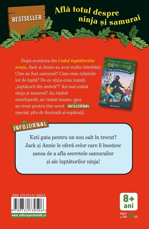 După aventura din Codul luptătorilor ninja, Jack şi Annie au avut multe întrebări: Cine erau samuraii? Care erau tehnicile lor de luptă? De ce ninja erau numiți „luptătorii din umbră”? Azi mai există ninja și samurai? Au răsfoit enciclopedii, au vizitat muzee, apoi au creat pentru tine acest INFOJURNAL special, plin de ilustraţii şi explicaţii.