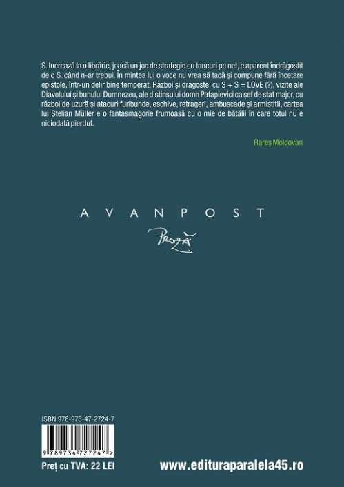 S. lucrează la o librărie, joacă un joc de strategie cu tancuri pe net, e aparent îndrăgostit de o S. când n-ar trebui. În mintea lui o voce nu vrea să tacă și compune fără încetare epistole, într-un delir bine temperat. Război și dragoste: cu S + S = LOVE (?), vizite ale Diavolului și bunului Dumnezeu, ale distinsului domn Patapievici ca șef de stat major, cu război de uzură și atacuri furibunde, eschive, retrageri, ambuscade și armistiții, cartea lui Stelian Müller e o fantasmagorie frumoasă cu o mie de bătălii în care totul nu e niciodată pierdut.